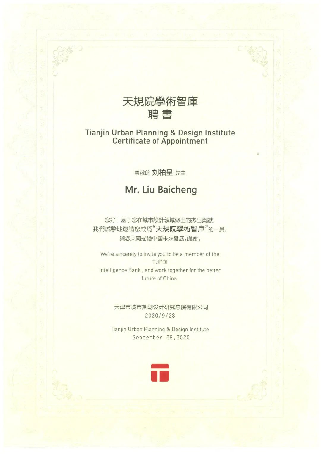 隨后,天津市城市設(shè)計規(guī)劃研究院黨委書記李洪剛為劉柏呈董事長頒發(fā)“天規(guī)院學(xué)術(shù)智庫”聘書,雙方將共同探索深度合作的專家智力支持機(jī)制,劉柏呈董事長也將為描繪天津城市發(fā)展的藍(lán)圖建言獻(xiàn)策,貢獻(xiàn)力量。